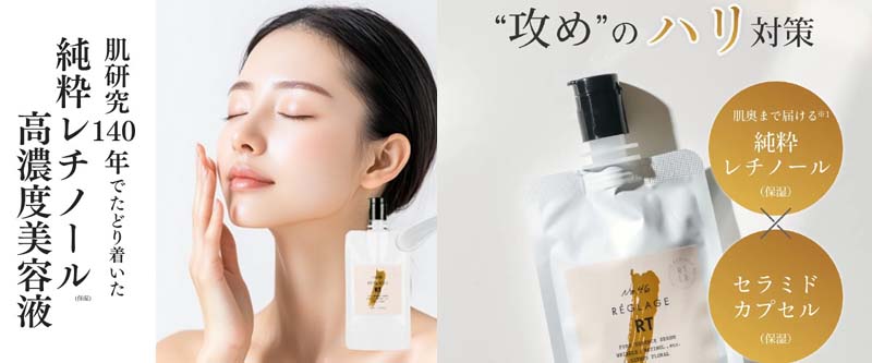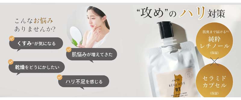 ・乾燥・小ジワ・ほうれい線が気になりはじめた ・肌のハリがなくなってきたと感じている人攻めの“ハリ”対策。高濃度 純粋レチノール美容液【REGLAGE ピュアRTセラム】  |