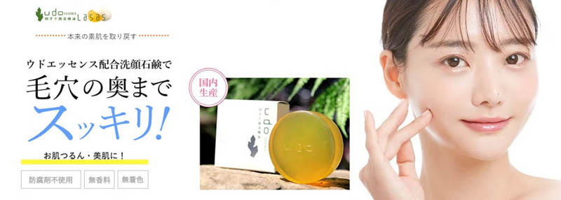 自社開発素材「天然ウド抽出成分」の除菌、保湿成分を配合、 100%植物油脂の石鹸素地とこだわりの天然由来素材機能素材を配合した洗顔石鹸!udo石鹸はこちら!  |